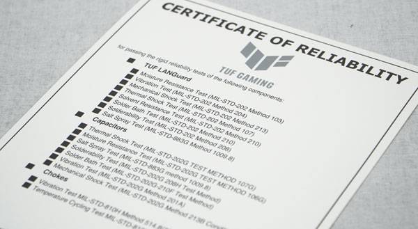또한 전원부에 쓰인 캐퍼시터와 초크는 CPU에 장기간 헤비 워크로드 발생처럼 전원부에 부하가 높아지는 상태에서도 안정적인 전원 공급이 가능토록 진동, 온도 순환, 물리/ 온도 충격, 습도 등 여러 분야에 걸친 밀리터리 인증을 받은 부품이 사용되었다.