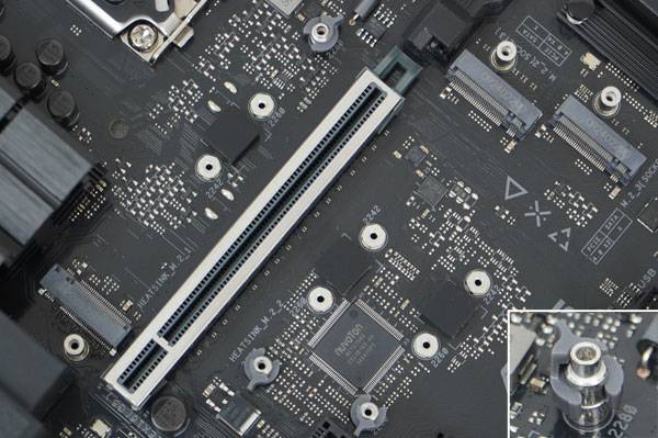 PCIe 5.0 x16 슬롯 주변에 M.2 SSD 발열 해소용 방열판이 기본 제공되는 2개의 M.2 소켓과, 방열판이 없는 M.2 소켓의 모습도 확인된다.