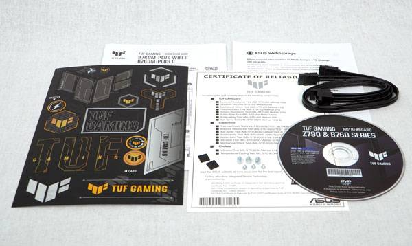 추가로, ASUS TUF GAMING B760M-PLUS II 코잇 메인보드의 M.2 소켓은 기본 2280 규격 M.2 SSD 장착이 고려된 설계지만, 그보다 짧은 M.2 SSD를 장착할 필요가 있을 때 사용하기 위한 스탠드오프와 고정 나사 세 쌍, SATA 케이블, 밀리터리 클래스 인증서 등이 제공된다.