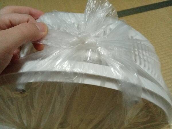 선풍기 전체를 세탁소 비닐이나 큰 비닐봉투로 씌웁니다. 비닐이 없다면 김장봉투, 재활용 봉투, 큰 비닐을 여러 개 이어서 사용해도 좋습니다.