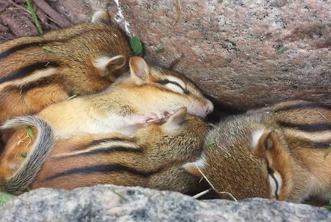 사진 속 다람쥐 가족은 매서운 바깥바람을 피해 가장 안전하고 아늑한 바위 틈을 보금자리로 삼았습니다.
