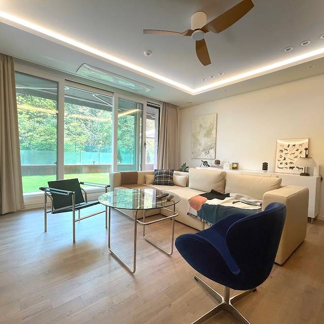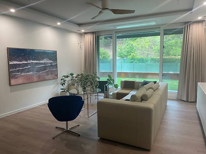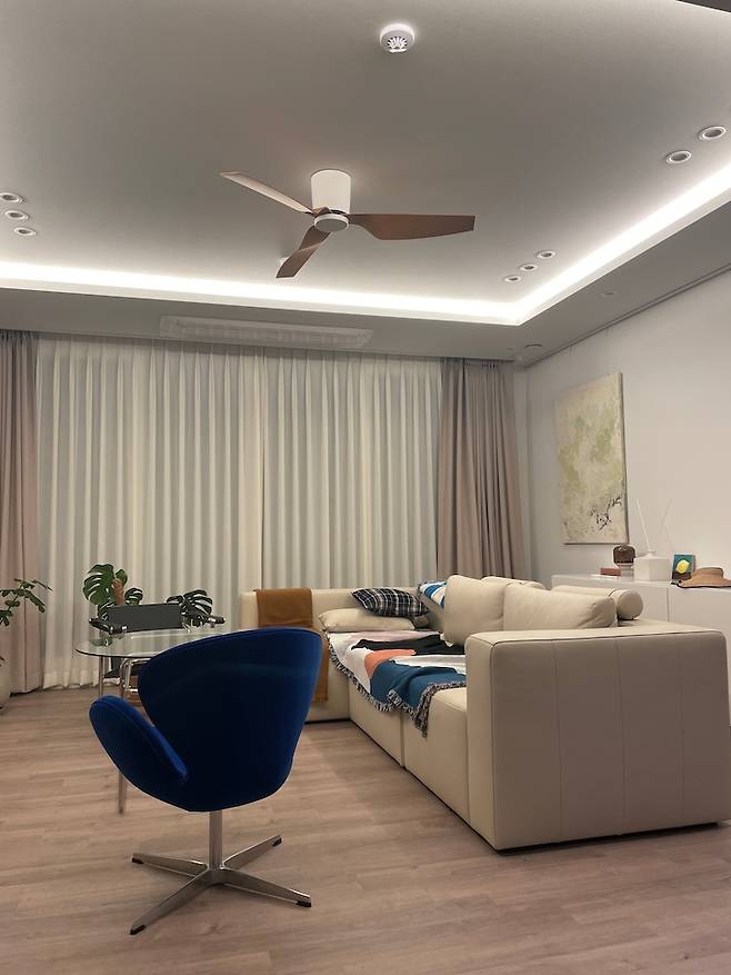 거실 리모델링의 주안점은 테라스 출입 동선 챙기기, 아트월 없애고 티비 자리 바꾸기, 직부등 없애고 다운라이트, 간접등, 실링팬 설치하기였습니다.