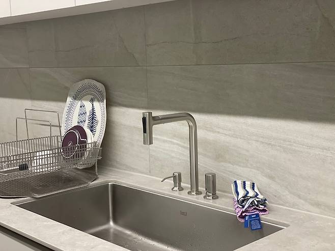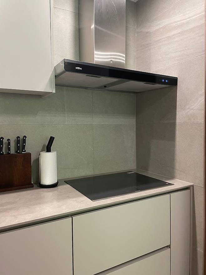 싱크대 상판은 하이막스 오로라 그레이지 컬러인데 벽타일과 너무 찰떡이라 설치된 모습을 보고 신이 났더랬죠. 웜톤 그레이 컬러인데 조금 색감 있는 주방을 원하시는 분은 염두에 두셔도 좋을 듯해요.