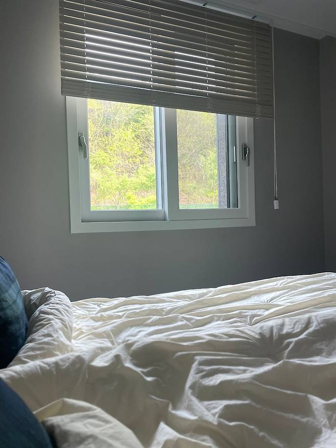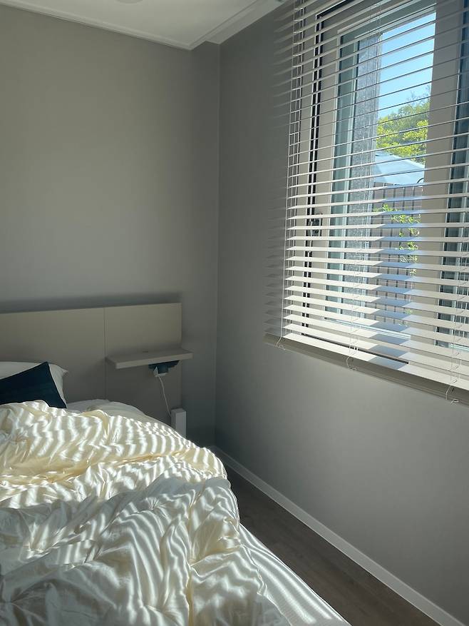집의 모든 공간에서 테라스를 내다볼 수 있어서 초록초록한 풍경을 볼 수 있어요. 침대 프레임에 콘센트는 저희가 따로 사서 연결했어요. 은근히 침대 주변에 콘센트가 필요하죠.