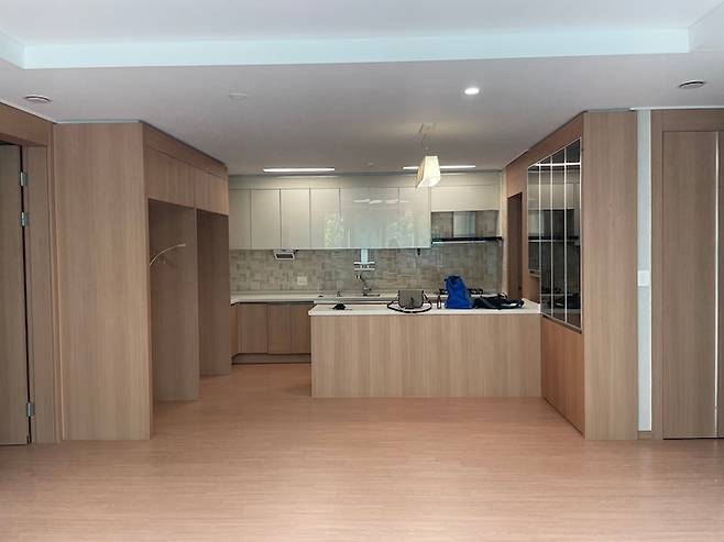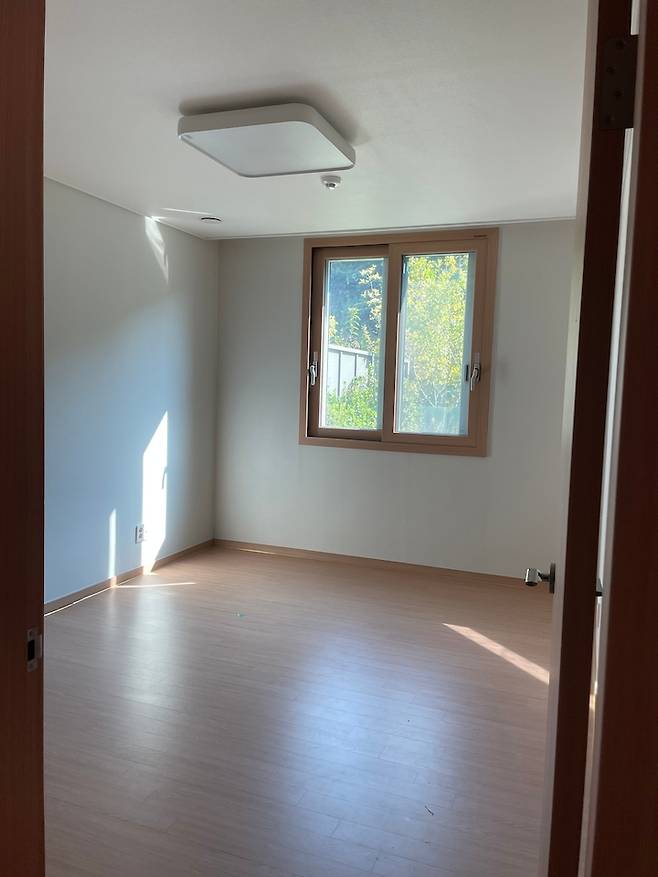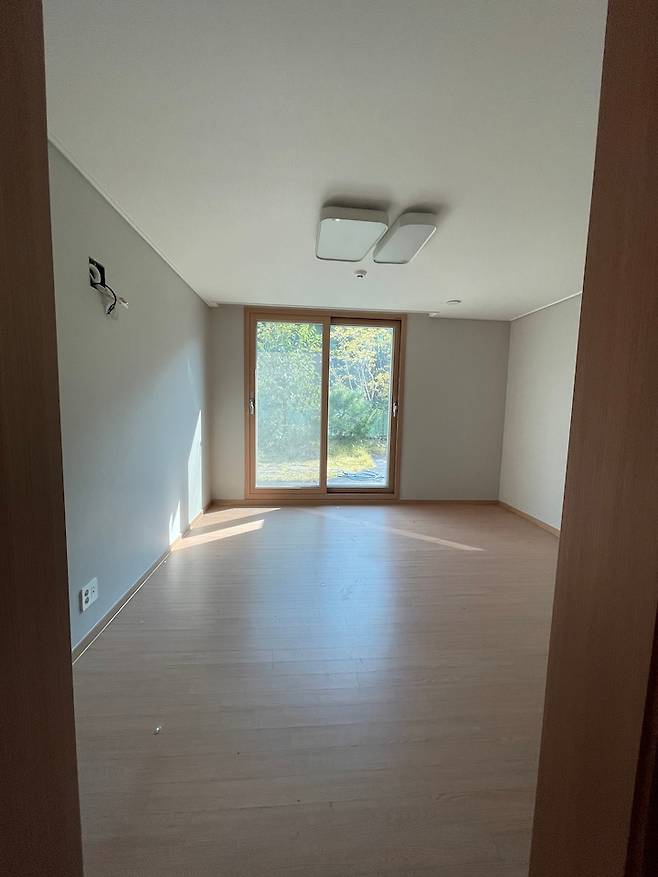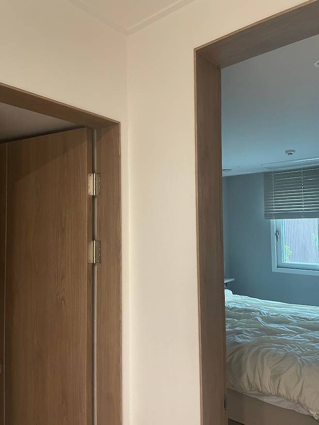보통 안방으로 사용하시는 제일 큰 사이즈의 방입니다. 테라스로 출입할 수 있는 문이 있는 게 특징입니다. 저희는 이 방을 남편의 서재방으로 사용하기로 했습니다. 그리고 처음부터 문이 없고 틀만 있었어요. 저희도 문 설치하지 않고 그대로 살려서 시공했습니다.
