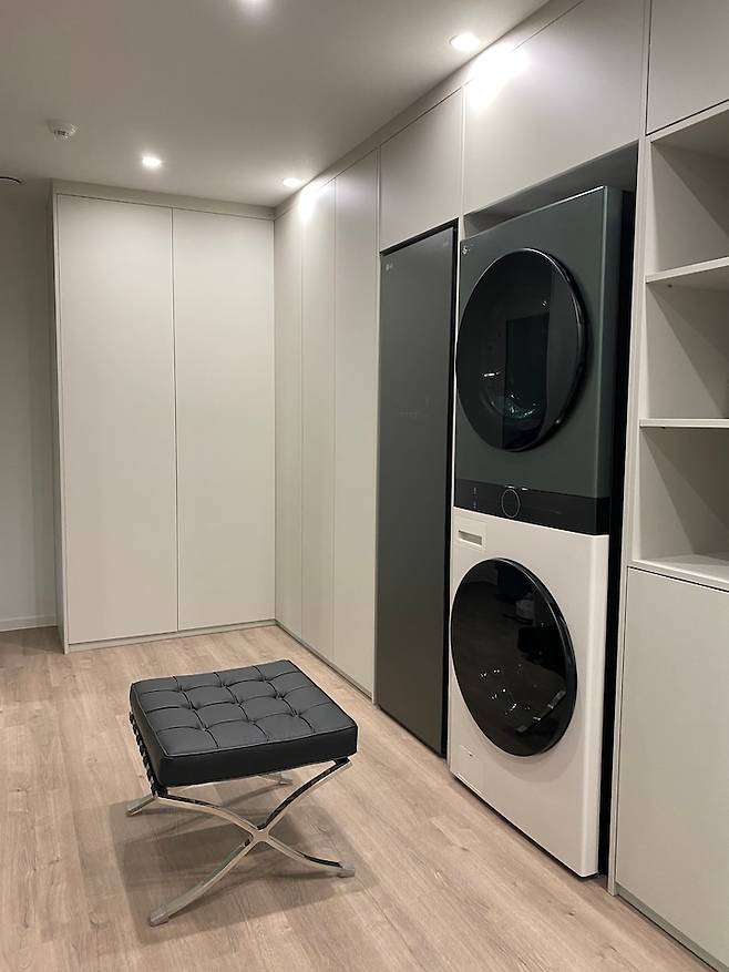 워시타워를 드레스룸에 넣으니 동선이 짧아져서 매우 편합니다. 당연히 소음은 약간 있고요^^; 하지만 감수할 수 있는 수준? 마룻바닥을 걱정하시는 분들도 있는데 저희는 전에도 드럼 세탁기를 실내에 놓고 사용했어요. 역류하거나 물이 새는 일은 제품이 고장 나지 않는 한 일어나지 않는다고 보시면 됩니다. 저도 사실 불안한 마음은 있어 설치할 때 기사님께 배관 깊이 배수관 넣어달라 요청드리긴 했어요 ^^;