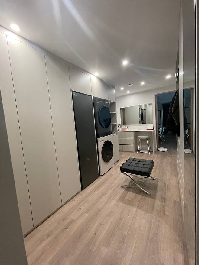 저희 드레스룸의 가장 큰 포인트는 배관 공사를 해서 워시타워를 설치한 점입니다. 붙박이장과 서랍장을 설치해서 수납을 최대한으로 넣고 워시타워와 스타일러를 넣었습니다.
