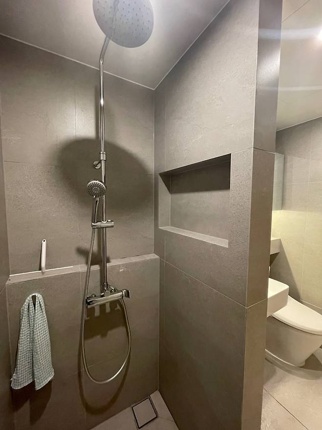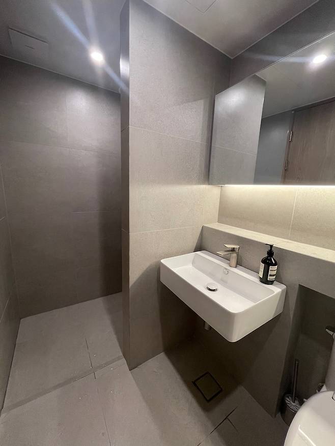 조적벽을 세우고 샤워실을 분리했습니다. 웜그레이 컬러 큰 사이즈 타일에 졸리컷이나 조적 벽으로 조금 더 힘을 줬으나... 욕실이 워낙 작아 티가 안 난다는 슬픈 사연이... ^_ㅜ