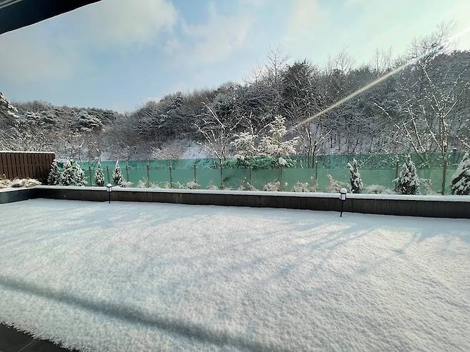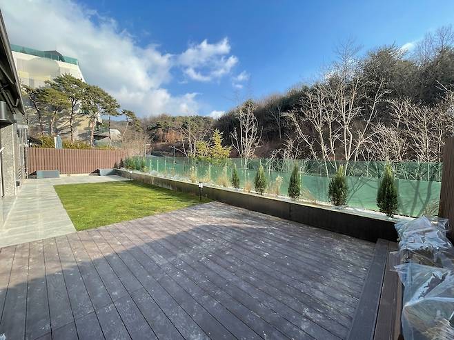 작년 겨울 입주 직후예요. 유리 난간 너머 저런 풍경이 있었는데 큰 나무에 다 가려져 있었어요 ^_ㅜ 테라스 바닥은 3등분을 하여 석재 데크, 천연 잔디, 목재 데크로 시공했습니다.
