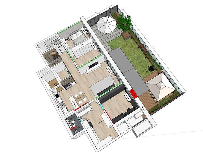 확장은 이미 되어 있어 확장이나 샷시(새시) 등 큰돈이 드는 공사는 피했지만, 화장실 두 곳과 주방, 붙박이장 등의 가구와 벽지, 바닥재 같은 마감재 등 대부분을 새롭게 시공했습니다. 그리고 제일 크게 변화한 곳은 테라스입니다. 기존 식재와 데크 등은 모두 철거 후 새로 시공 및 식재하였습니다.