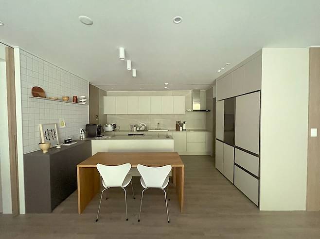 주방은 ㄱ자+아일랜드에서 11자로 변경하고 구성이 좀 더 간결해졌어요.