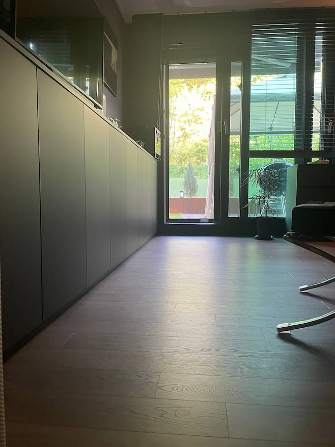 거실 양 끝에 티비와 소파를 놓으면 가운데 공간이 낭비되는 게 싫어서 소파를 벽에서 띄운 후 수납장을 두었어요. 테라스 출입이 편하도록 모든 가구를 배치했어요. ㅁ자로 가구가 모여 있기 때문에 거실에서 빙글빙글 돌며 산책이 가능합니다 ^^ㅋㅋ