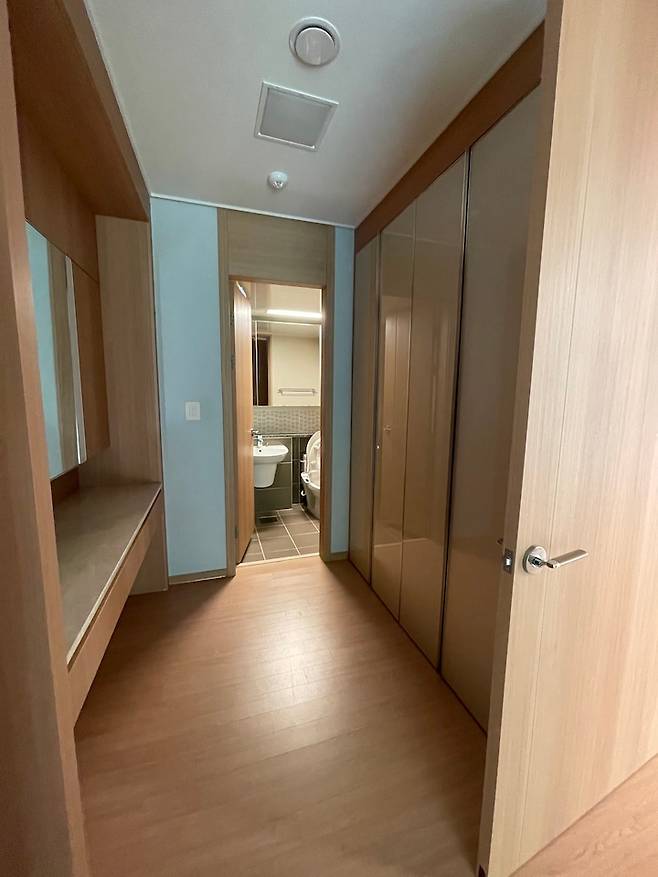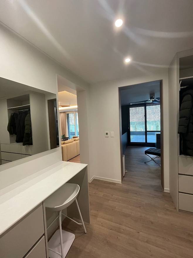 파우더룸 공간과 큰 방(기존 안방), 작은방, 화장실로 이어지는 통로 역할을 하던 공간이에요. 이도 저도 아닌 공간이 아까워서 가벽을 철거하고 작은방과 합쳐 드레스룸으로 사용하기로 했어요.