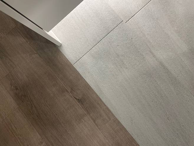 실제 색감과 가장 비슷합니다. 현관 타일도 웜톤으로 고른 덕에 잘 어울립니다. 마루와 단차 없이 타일과 1:1로 만나는 면은 작업자분들이 신경을 많이 써주신 듯해 만족스러웠답니다.