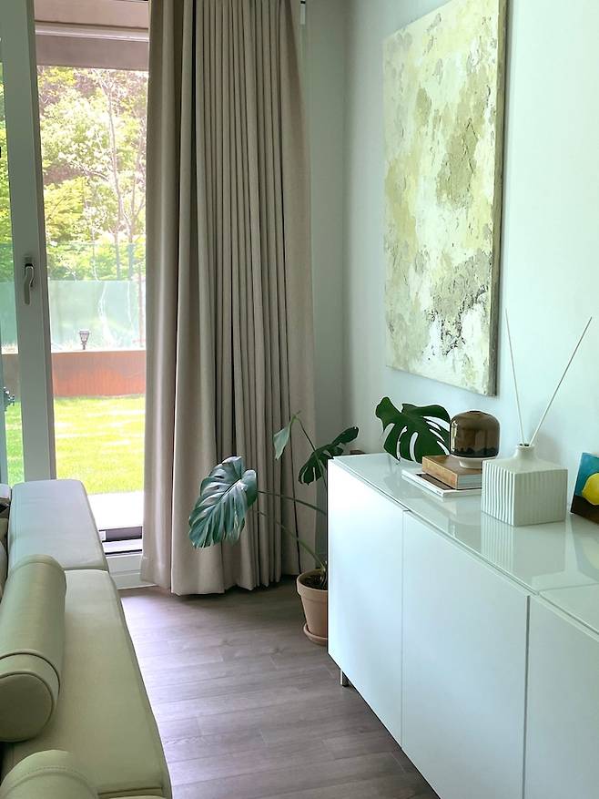 무조건 거실에 전동 커튼을 설치하는 게 목표였기 때문에 리모델링 시공 시 커튼 박스 안쪽으로 콘센트를 부탁드렸고요. 차르르와 암막 이중으로 설치했습니다. 커튼은 동대문종합상가 1층에서 구입했어요.