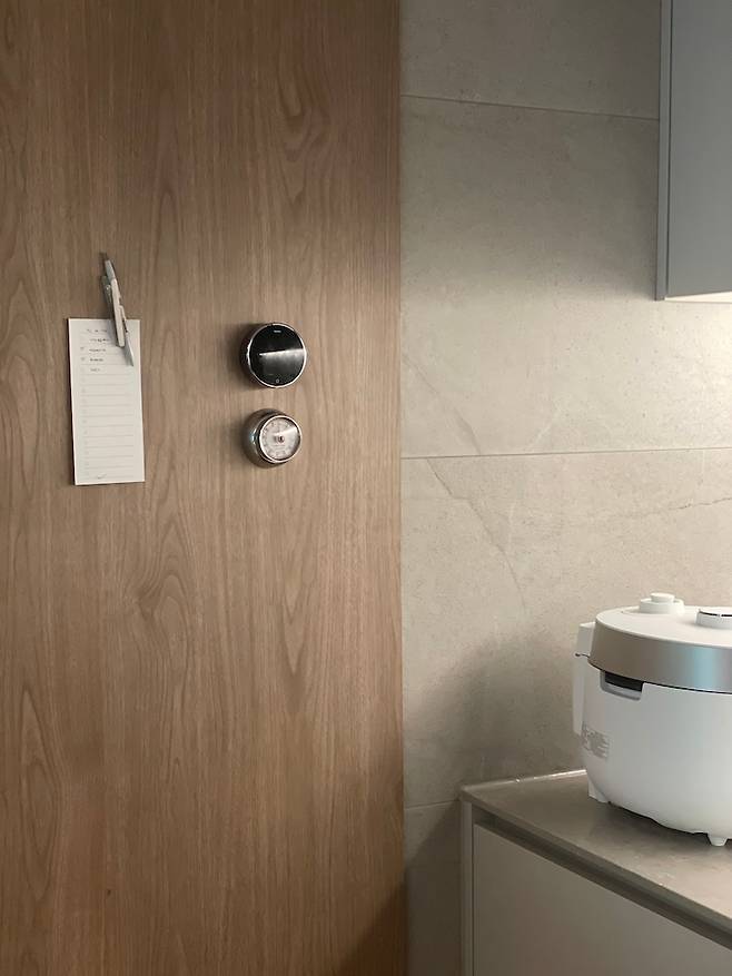 안쪽에 철판 같은 소재를 대고 필름을 입혀서 자석을 붙일 수 있게 해주셨어요, 메모도 붙이고 타이머도 붙여놓고 요긴하게 쓰고 있어요, 무엇보다 문과 같은 컬러로 제작해서 대놓고 '나 철판이오' 하지 않는 게 좋아요.