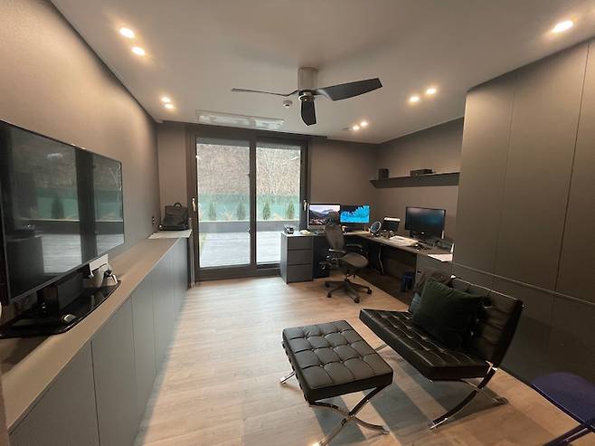 신랑은 컴퓨터, 게임기, 책 등등 뭔가 모으는 걸 좋아하는 성향이라 짐이 많아요. 그래서 장을 잔뜩 짜서 모두 수납할 수 있게 했습니다. 노출되면 먼지도 많이 쌓이고 지저분하다며 모두 도어가 달린 장으로 제작했어요. 그래서인지 항상 깨끗해 보이네요. 벽지도 그레이로 하고 천장만 화이트로 했어요.