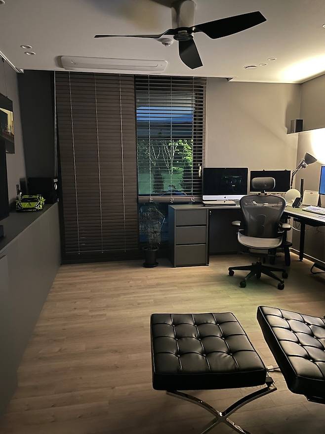 책상은 2m와 1.8m로 두 개를 제작하여 ㄱ자로 배치하였습니다. 남편이 일하다가 눈만 돌리면 창밖이 보이는 곳에 책상을 꼭 놓고 싶다고 해서 지금의 배치가 되었습니다.