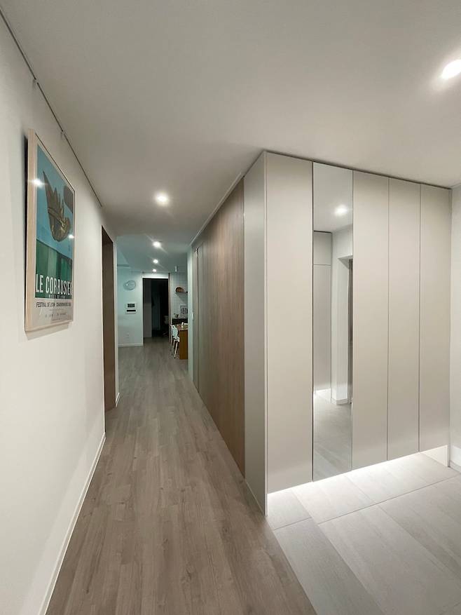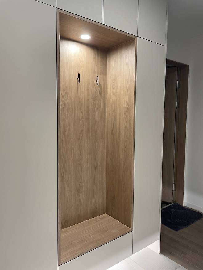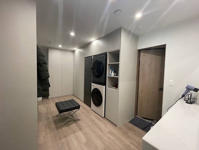 우측 욕실에서 수도와 배관을 끌어오는 공사를 했어요. 욕실 옆이라 가능했던 공사 같아요. 워시타워가 완전히 들어가도록 장을 키우는 건 너무 거대해져서 무리였는데요. 그래도 맘에 걸려 막판에 10cm 더 깊게 변경을 요청했더니 이미 들어간 천장 매입등 위치가 애매해져서 살짝 아쉬워요. 그래도 살면서는 크게 보이지 않네요 ㅎㅎ