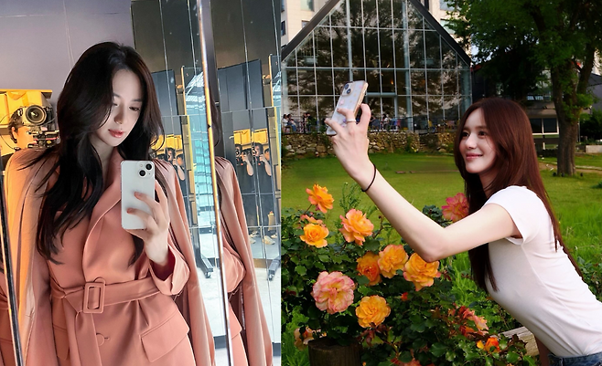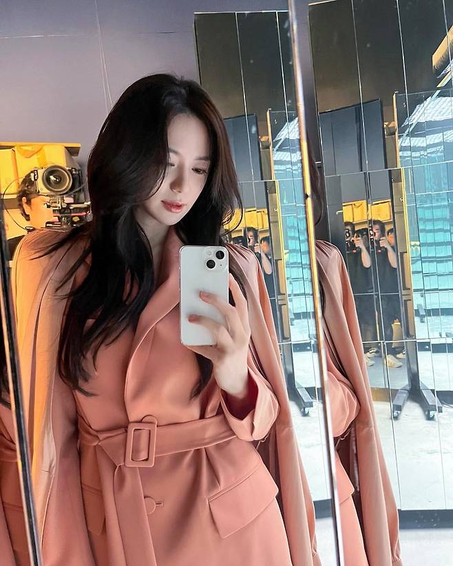 이엘리야는 벨트로 허리를 강조한 핑크 컬러 슈트로 페미닌하면서도 트렌디한 매력을 드러낸다. 재킷을 어깨에 걸친 연출과 자연스럽게 흐르는 긴 웨이브 헤어가 세련된 도시 여성의 이미지를 완성한다. 미러 셀카를 통해 자신감 넘치는 스타일 감각을 표현하고 있다.