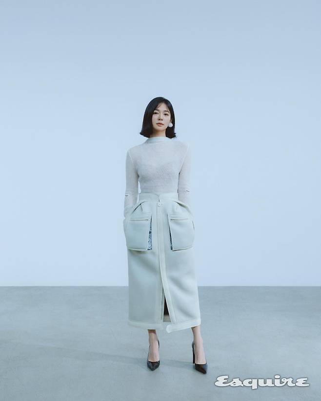 이엘리야는 화이트 시스루 톱과 구조적인 하이웨이스트 롱스커트로 미니멀리즘의 세련미를 선보이고 있다. 상의는 슬림하게 몸에 밀착되어 우아한 실루엣을 강조하며, 스커트는 오버사이즈 포켓과 절제된 디테일로 현대적인 감각을 더한다. 블랙 하이힐로 마무리해 전체적으로 절제된 고급스러움을 연출한다.
