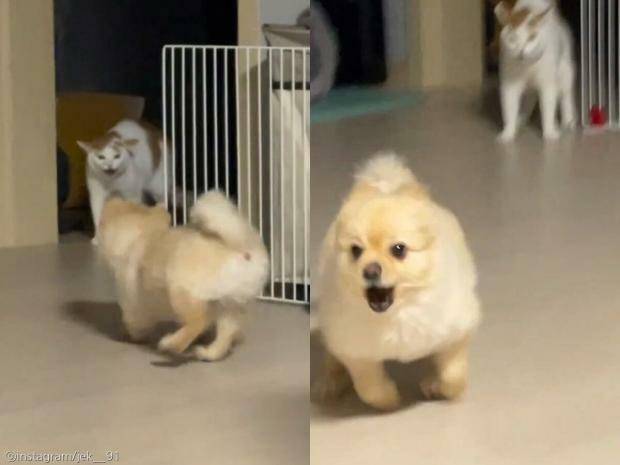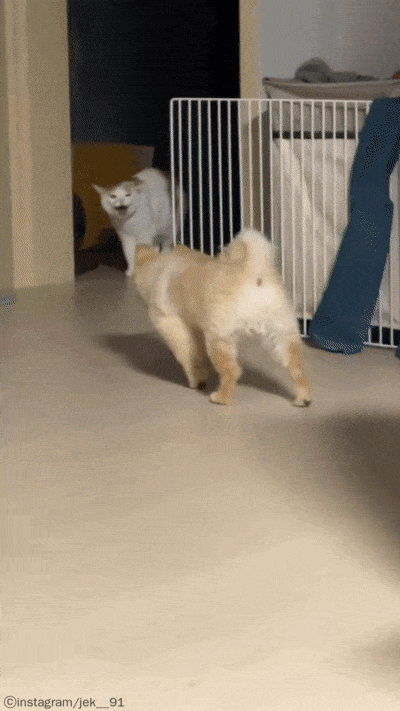 [노트펫] 고양이 하악질에 깜짝 놀라 냅다 줄행랑치는 강아지의 모습이 사람들에게 웃음을 주고 있다.