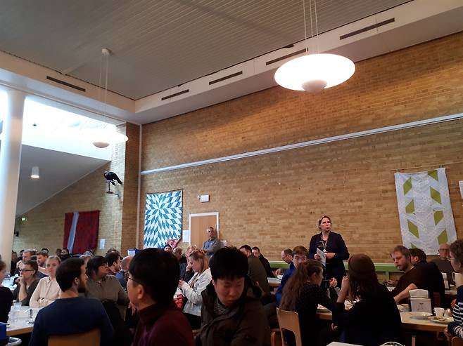 에프터스콜레(청소년을 위한 덴마크의 갭이어 제도) 교사 양성학교 방문 중 점심시간에 있던 일이다. 수백 명이 식사하는 학교 내 식당에 40여 명의 한국인 방문객인 우리의 자리는 따로 정해지지 않았다. 여행 주최 측은 서로 교류할 겸 아무 곳이나 빈자리에 앉으라고 권했다.
