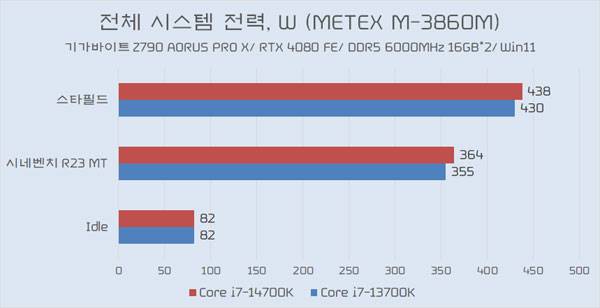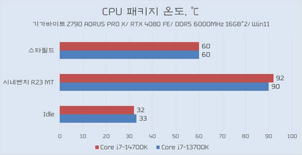 결과를 보면 아이들 상태에서 전력과 발열은 거의 차이가 없고, 풀로드 상태(시네벤치 R23 멀티스레드)와 게임 플레이(스타필드)의 전력은 딱 늘어난 E-코어와 빨라진 클럭의 영향으로 판단된다.