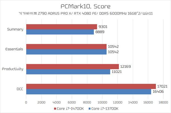 먼저 일상적인 용도의 PC 성능을 측정하는 PCMark10, 각종 연산 성능 측정을 위한 긱벤치 성능을 측정했다. 멀티 코어 성능이 요구되는 테스트에서는 당연히 전반적으로 코어 i7-14700K가 더 좋은 성능을 내준다. 싱글 코어에서도 높아진 클럭에 비래해 코어 i7-14700K에서 더 나은 경험을 기대할 수 있다.