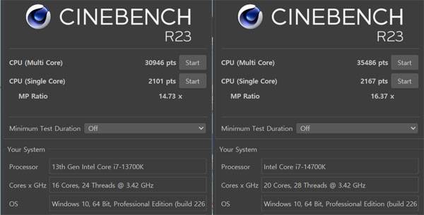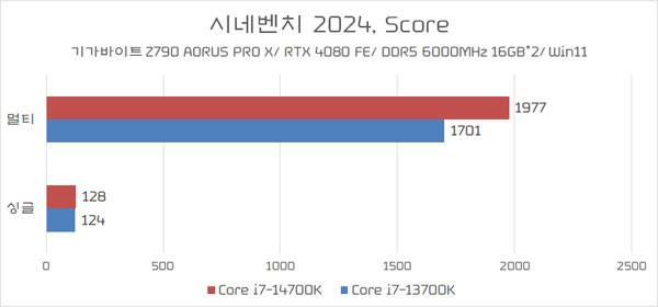 CPU 성능 측정용으로 폭 넓게 쓰이고 있는 시네벤치 R23, 최신 업데이트 버전인 시네벤치 2024 버전의 결과를 정리했다. 코어 i7-14700K의 멀티 코어성능은 대략 15%, 싱글 코어 성능은 약 3% 높은 결과가 나왔다.