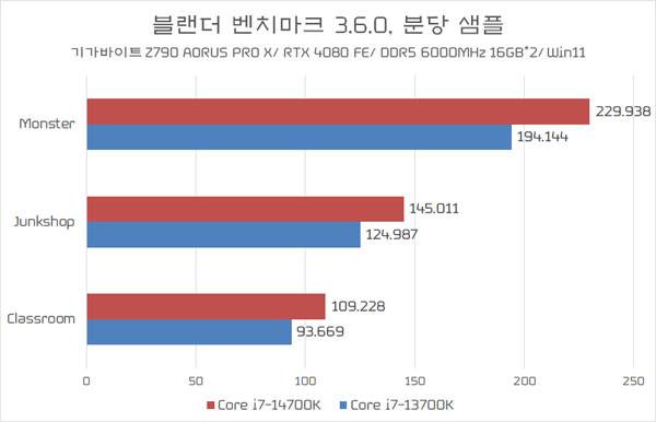 블랜더 3.6.0 버전의 벤치마크 결과를 보면 코어 i7-14700K가 대략 최대 18%가까이 더 높은 성능을 내준다.