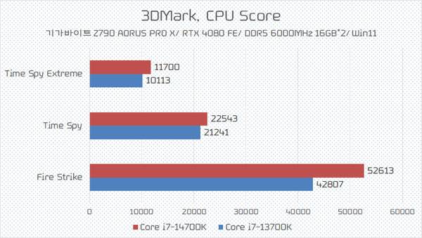 코어 i7-14700K의 게임 성능은 어떨까? 우선 3DMark 테스트의 CPU 성능 결과를 정리했다.