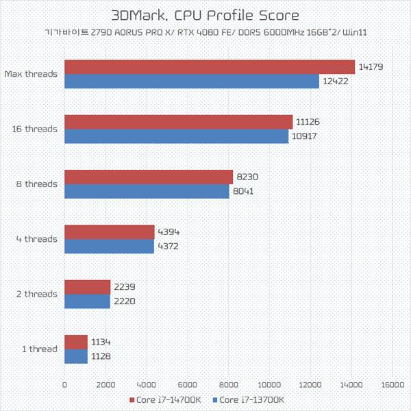 그래픽 카드 성능 테스트를 위한 필수 테스트 중 하나로 꼽히는 파이어스트라이크와 타임스파이의 CPU 성능 항목을 보면 코어 i7-14700K가 최대 22%까지 높은 성능을 내주고, CPU의 스레드별 성능을 측정하는 CPU 프로파일 테스트를 보면 16스레드까지는 코어 i7-14700K가 소폭 높긴하지만 거의 동일한 성능을 내준다.