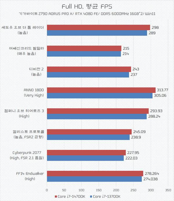 결과를 보면 대체로 코어 i7-14700K가 높고, 성능 차이도 최대 8프레임 가까이 나기 때문에, MSRP가 동일한 13세대와 14세대 중 고민 중이라면 14세대를 선택할만하다.