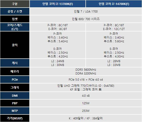 코어 i7-14700K, 20코어 28스레드로 업그레이드