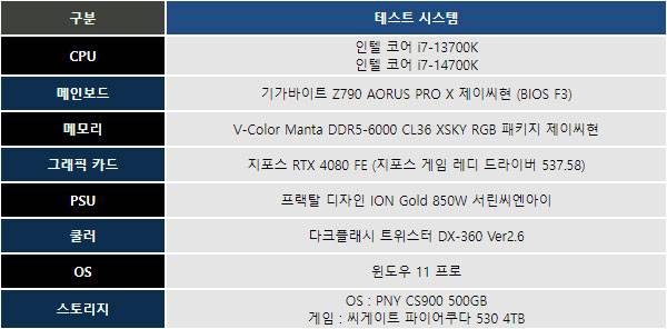 한편, 코어 i7-13700K 대비 코어 i7-14700K의 성능을 알아보기 위한 테스트는 위와 같은 시스템에서 진행되었다. 랩터 레이크 리프레시 대응을 위해 업그레이드되어 출시된 기가바이트 Z790 어로스 프로 X 제이씨현 메인보드(BIOS F3)에서, V-Color Manta DDR5-6000 CL36 XSKY RGB 패키지(16GB*2) 제이씨현 메모리, 각종 테스트용 프로그램과 게임은 씨게이트 파이어쿠다 530 4TB에 설치하였다.