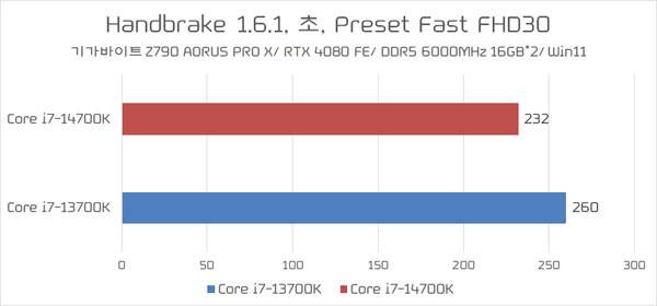 핸드브레이크 1.6.1 버전의 Fast Full HD 30p 프리셋을 이용해 Big Buck Bunny 4K 4K 영상을 변환하는 시간을 측정했다. 코어 i7-14700K가 약 30초 가까이 빠르게 작업을 끝내, 대략 10% 가량 높은 작업 성능을 기대할 수 있다.