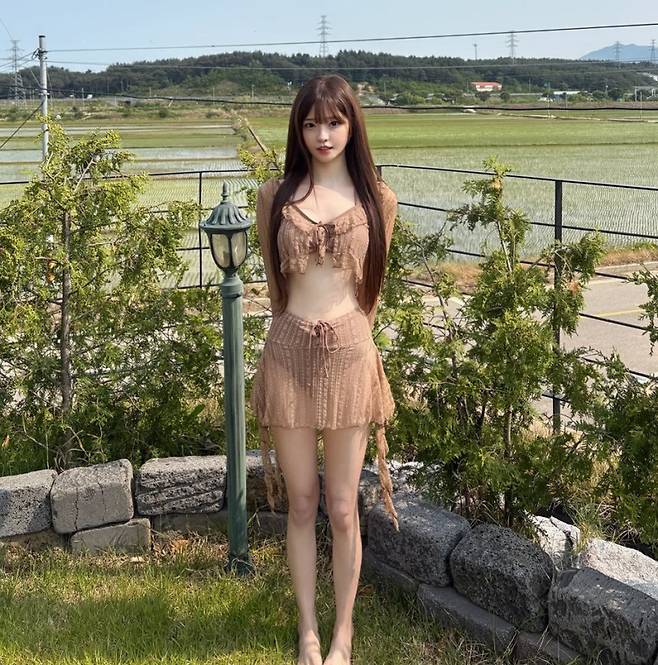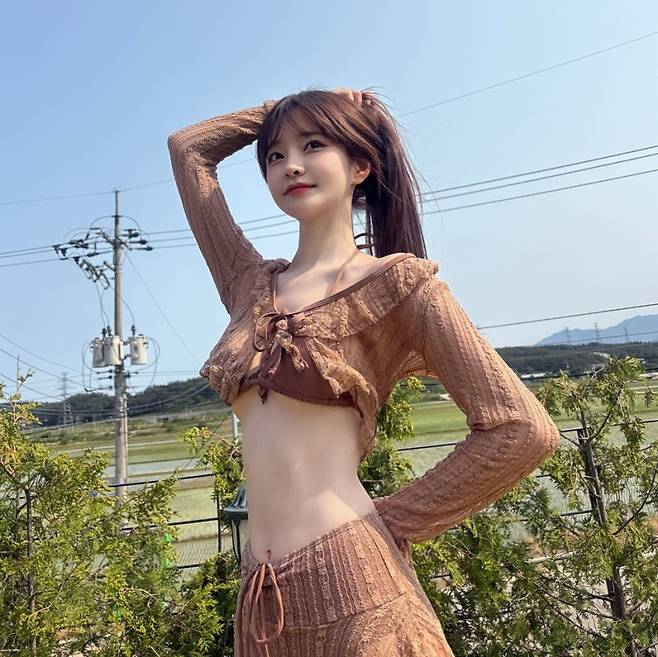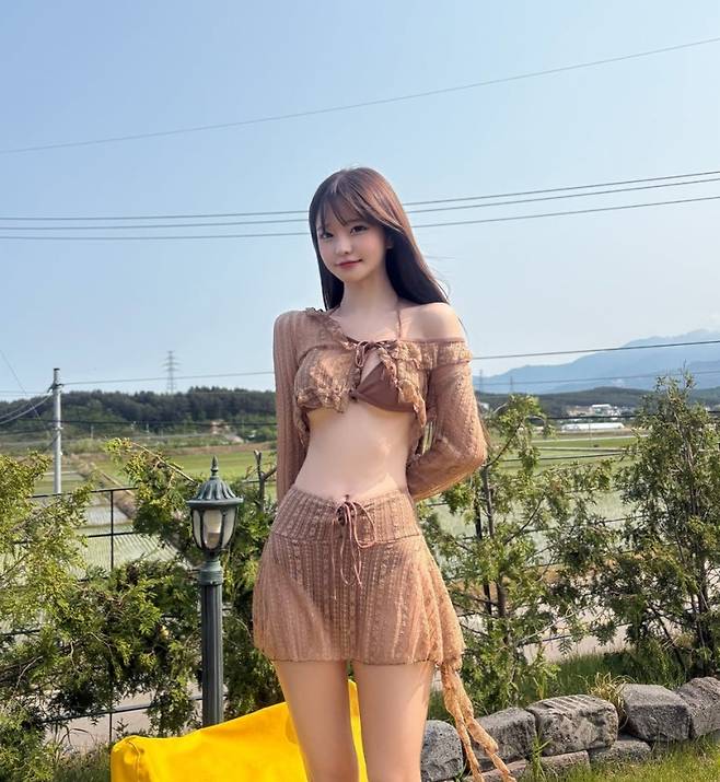 브라운 컬러의 비키니 위에 시스루 크롭 가디건과 스커트를 더한 두 번째 착장은 그야말로 여리여리한 여신 강림입니다. 바람에 살랑이는 가디건과 잘록한 허리 라인이 완벽한 조화를 이루면서 꾸안꾸 느낌의 리조트룩을 완성했습니다. 야외에서 햇살을 받으며 걷기만 해도 화보 한 컷이 되는 모습입니다.