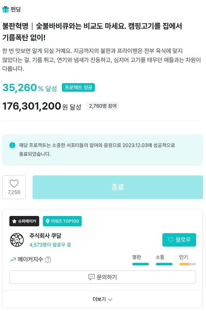 손병호: 저도 많이 놀랐습니다. 와디즈 1차 오픈으로만 1억 7천 넘게 팔았어요. 와디즈 불판 카테고리 역사상 압도적인 1위 기록을 세워버렸죠. 그 뒤로 3차례 걸쳐 펀딩을 했는데 총 3억 넘게 팔렸고요. 반응도 굉장히 좋아요. 현재 카카오와 쿠팡, 양쪽 모두 고객만족도가 97%예요.