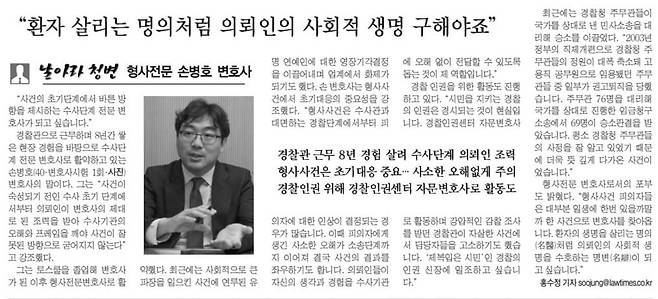 손병호: 네. 민간인 사찰 사건 관련 책이나 기사 검색하면 제 이야기나 인터뷰도 나옵니다. 제가 뭐 정의로운 경찰로 포장도 되고… 사실 팀장님이 정말 크게 칭찬을 받으셔야 하는데 민망했죠. 근데 또 변호사가 되니까 주로 피의자, 피고인을 맡게 됐어요. 변호사는 사실 범죄 혐의를 받는 분들이 큰 고객이잖아요. 그러다 보니 참 마음이 복잡했고 부담도 컸어요.