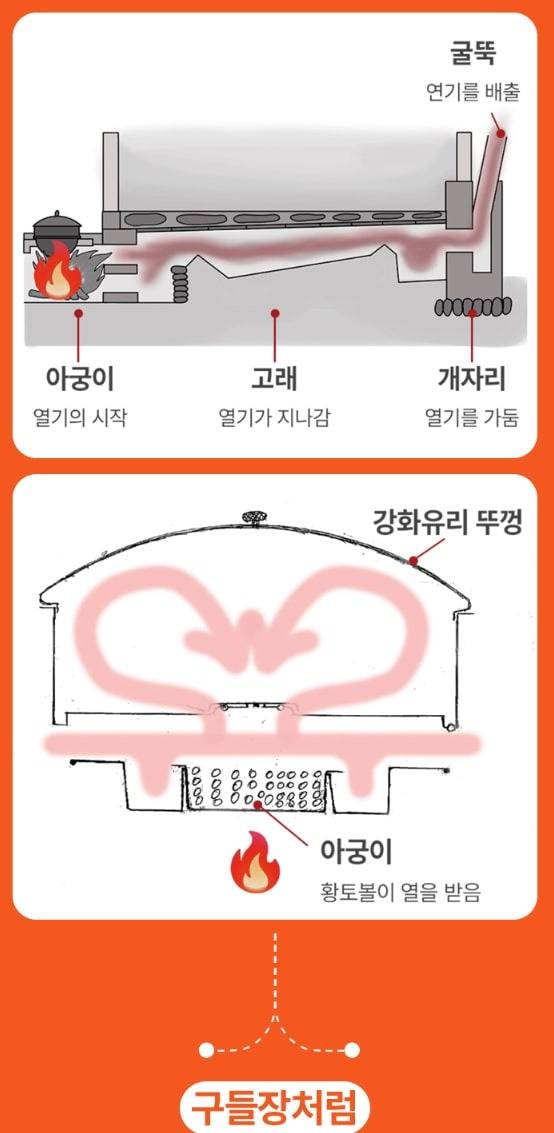 손병호: 아까 이중 구조라고 말씀드렸잖아요. 상부가 구들판이고 하부가 아궁이에요. 먼저 아궁이에 불을 붙이면 그 안에 있는 황토볼들이 열기를 머금습니다. 그 열이 구들판의 중앙에 뚫려있는 작은 열기 유입부들을 통해 위로 퍼져나가요. 그렇게 올라온 열기가 위에 덮인 뚜껑에 막혀서 열기가 오븐처럼 대류하는 원리인 거죠.