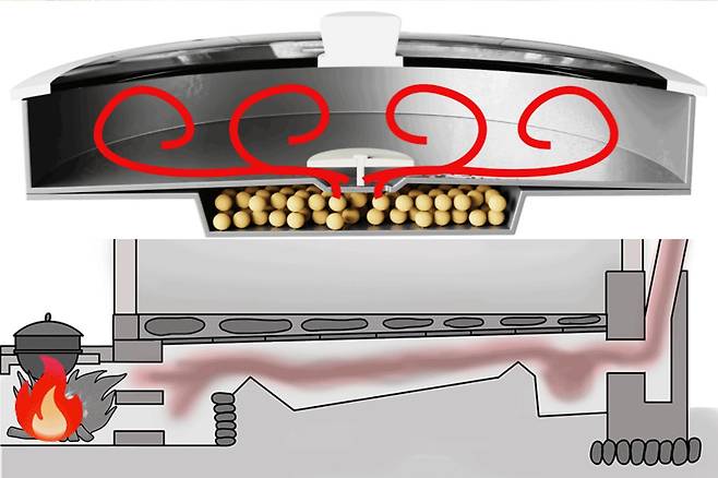 손병호: 대류열이 끝이 아닙니다. 황토볼이 열을 받으면 원적외선을 내놓아요. 원적외선은 전자기파니까 복사열이 되겠지요. 그리고 구들판에 직접적으로 가해지는 열은 전도열이 되는 거고요. 전도, 대류, 복사, 이렇게 열의 이동 3요소가 다 적용되는 불판을 만든 거죠.