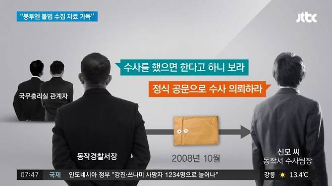 손병호: 이래가지고 거의 한 달 동안 수사 안 했어요. 그러니까 총리실에서 전화 와가지고 팀장님한테 쌍욕하고 그랬죠. 그렇게 총리실로부터 정식으로 수사 의뢰 공문을 받기로 하고 어찌저찌 수사는 하게 됐는데 일체 혐의 없다고 내사 종결했어요. 그러니까 또 총리실에서 팀장님이랑 저를 좌파 경찰이다 뭐다 하며, 내사 종결된 걸 살려서 검찰에 송치하고…