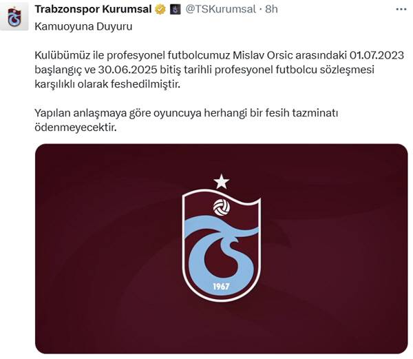 튀르키예 클럽 트라브존스포르는 21일(현지시각) '클럽과 오르시치의 계약이 상호 합의 하에 종료됐다. 계약에 따라 선수에게 위약금은 지급되지 않는다'고 발표했다.