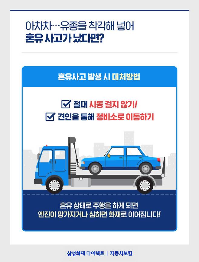 마찬가지로 주행 중 혼유 사고를 알아차렸다면, 그 즉시 시동을 끄고 견인을 통해 정비소로 이동해주는 것이 안전합니다.