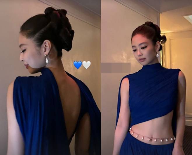 지난해에 이어 올해도 참석한 제니는 코발트블루 컬러의 미니 드레스로 시선을 모았다. 온몸을 휘감은 드레스 사이로 과감하게 허리와 등 라인을 드러냈다. 이 드레스는 튀니지 출신 프랑스 패션 디자이너 브랜드 알라이아의 제품이다.