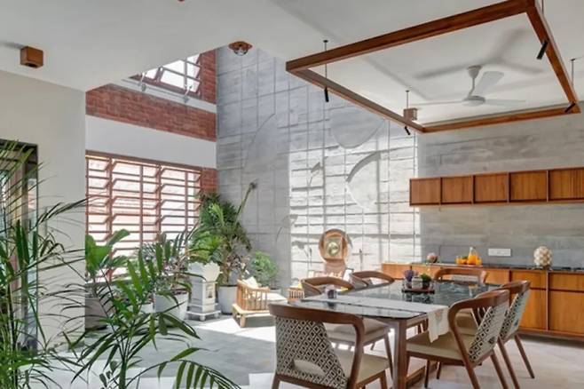 이 중정은 단순한 장식 이상의 역할을 하며, 거주자 간의 시선을 이어주고 가족 간의 유대감을 형성하는 공간이다. 식물이 자랄 수 있는 충분한 공간이 있으며, 위에서 떨어지는 빛은 시간의 흐름을 드러낸다.