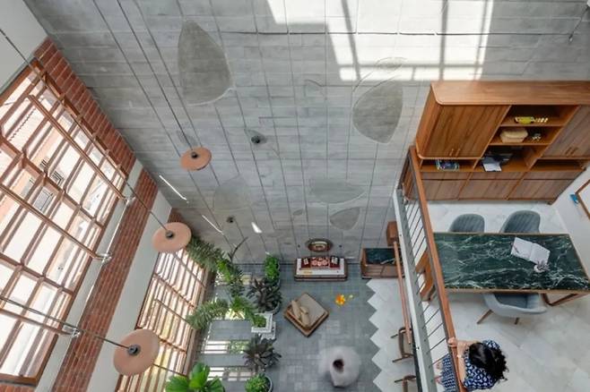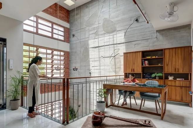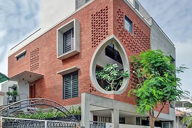 붉은 벽돌과 콘크리트가 그대로 노출된 이 주택은 인도의 약 60평 대지에 자리하고 있다. 외관은 자연 소재를 그대로 활용해 절제된 아름다움을 드러낸다.