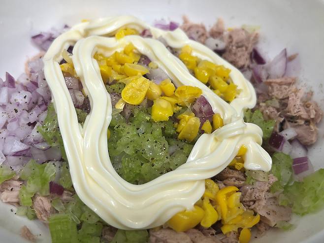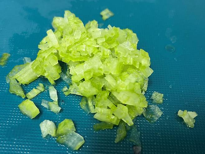 셀러리 줄기를 다져서 넣으면 셀러리 특유의 시원하고 깔끔한 향이 느끼함을 잡아주고, 입맛을 돋웁니다. 또한 부드러운 참치에 아삭함이 더해져 식감이 좋아집니다.