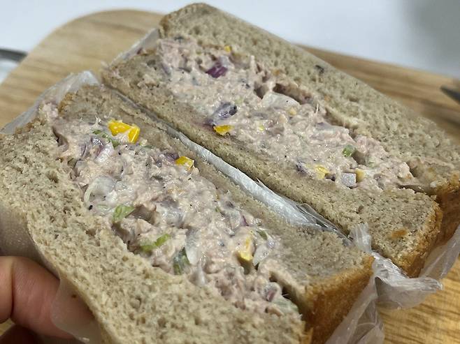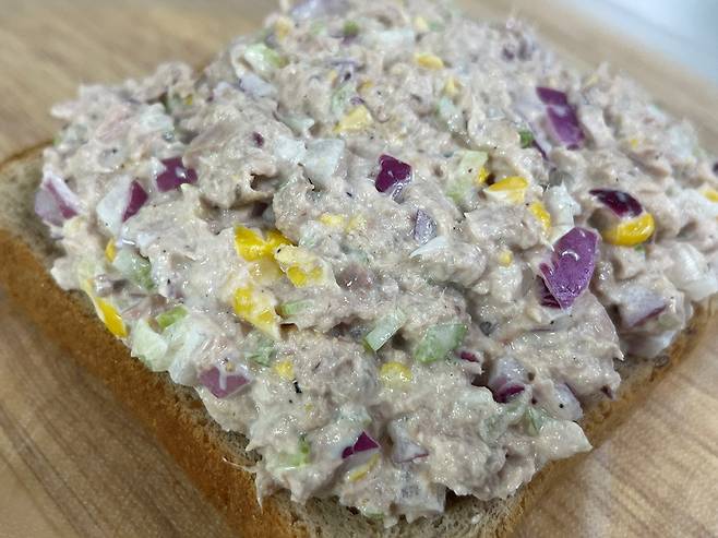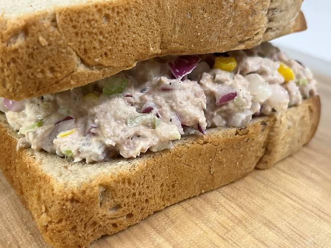 위에 빵을 한쪽 덮고 반으로 잘라서 드시면 됩니다. 양파와 셀러리, 그리고 레몬즙 등이 들어가 참치 비린내와 느끼함을 없애고, 깔끔한 맛이 납니다.